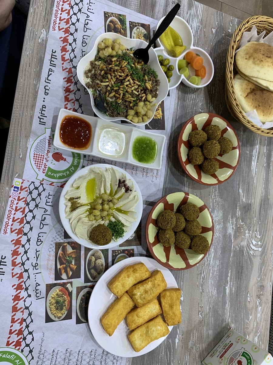 We recently had the pleasure of dining at Falafil Al Rabiah Al Khadra, and it was a truly delightful experience. We were a group of four and ordered a variety of traditional Arabic dishes — while I can’t recall all the exact names, a few of them left a lasting impression. One of the standout dishes was Shoul Shoka, a hearty and flavorful dish that was rich in spices and felt like real comfort food. Another memorable item was a white pea dish with peanuts, which was both unique and incredibly tasty — something we don’t often find in most casual Arabic restaurants. It had a warm, earthy flavor that paired perfectly with the freshly served bread. Speaking of bread, the Khaboos deserves a special mention. Soft, warm, and straight out of the oven, it had that authentic Arabic touch that elevated the entire meal. Every bite felt like a taste of Middle Eastern tradition, and the combination of all dishes together made for a filling and satisfying experience. The restaurant itself was clean, cozy, and inviting. It had a humble charm and felt perfect for both quick bites and casual group meals. The staff was cooperative, friendly, and attentive, making sure we had everything we needed and always responding with a smile. Overall, Falafil Al Rabiah Al Khadra offers genuine Arabic flavors in a comfortable setting. We truly enjoyed our visit and would gladly return to try more from their diverse menu.